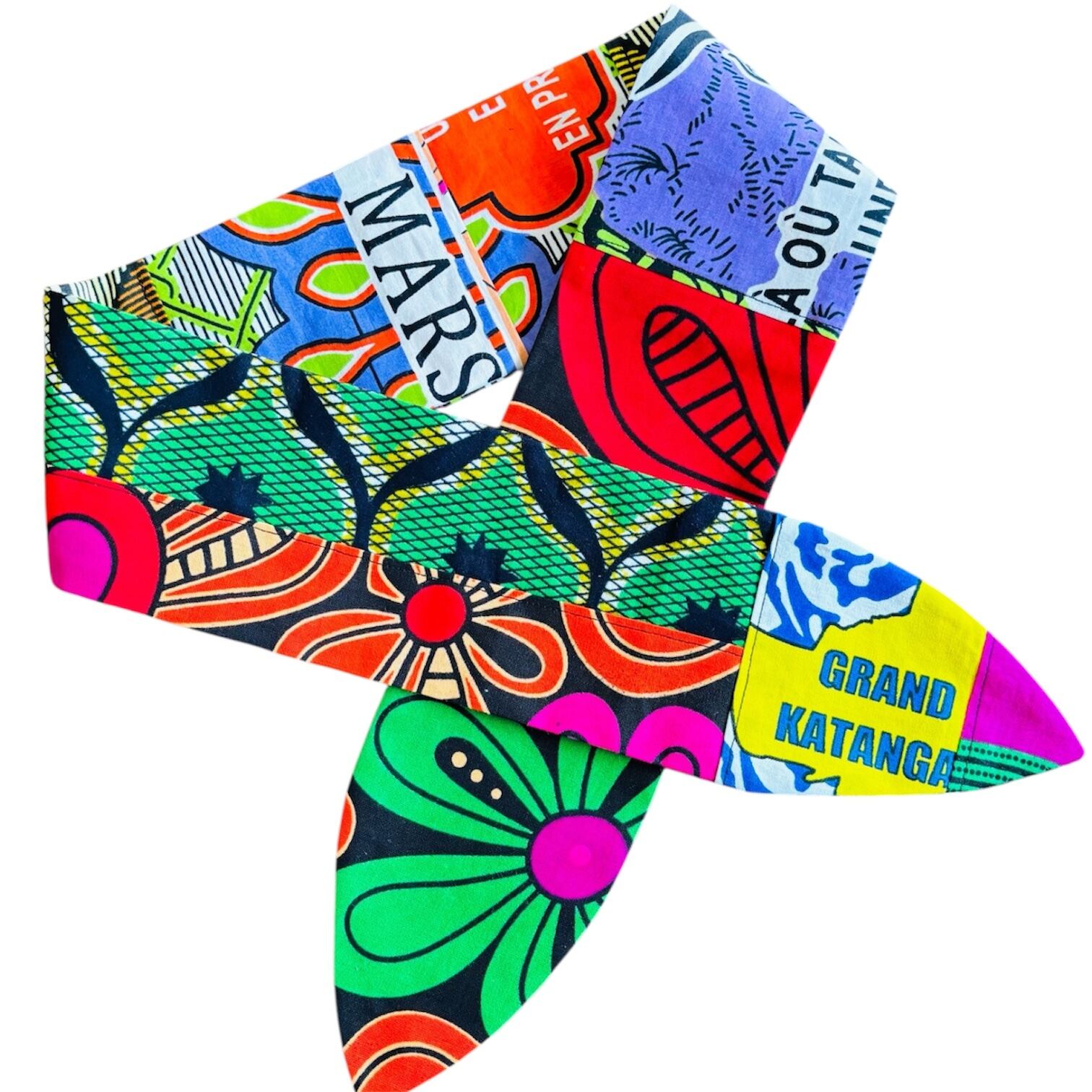 カラフルで様々な柄のアフリカンバティックのカケラ達をパッチワークで合わせクールネックに仕上げました。